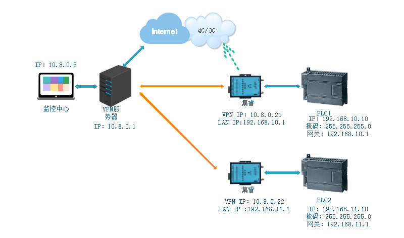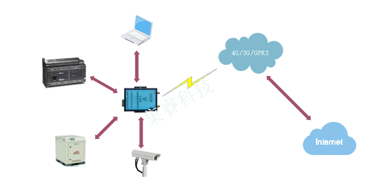 无线数据采集传输 : 把现场设备、PLC、仪器、计量表、传感器、采集终端等设备的数据通过4G无线网络实时传输到数据中心。