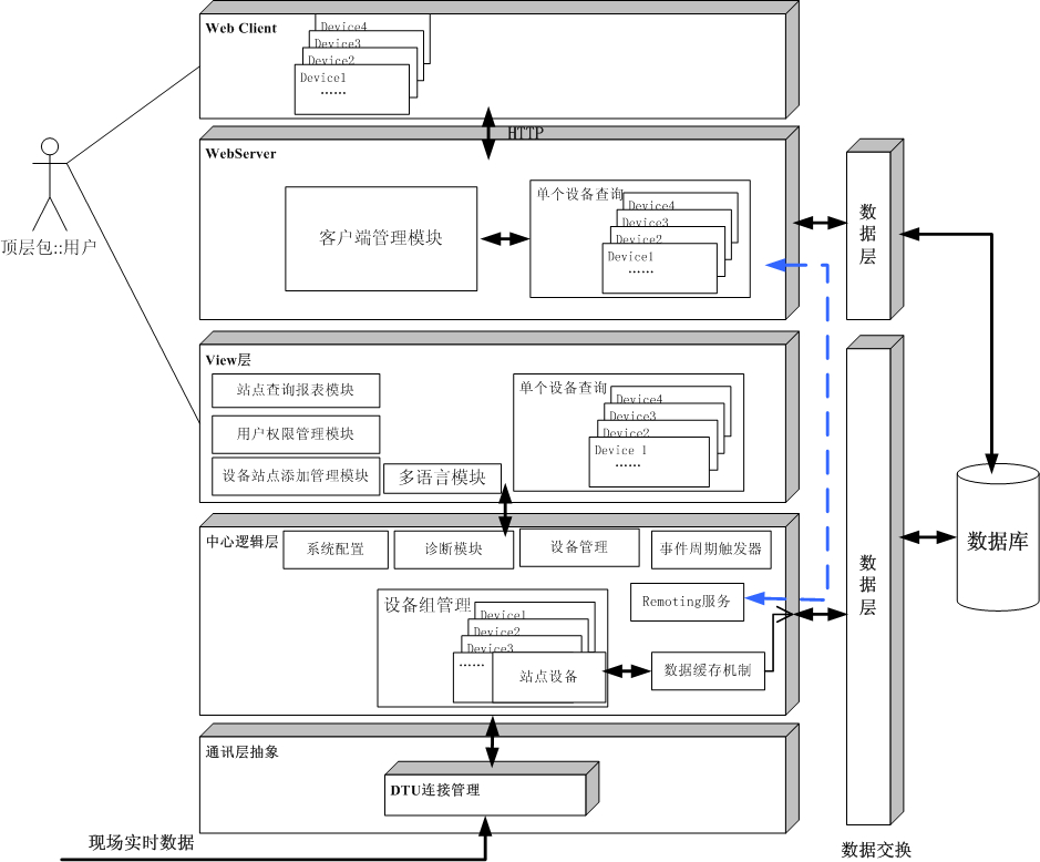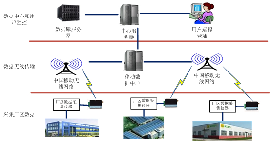数据中心主要完成接收厂区厂房内现场数据、数据处理、保存、显示、远程登陆等功能,数据中心及WEB系统结构框图如下