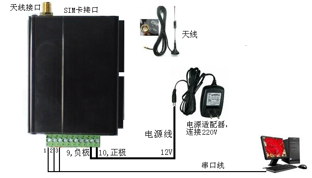参照DTU的接口定义,用串口线把DTU和电脑连接起来,如下图所示: