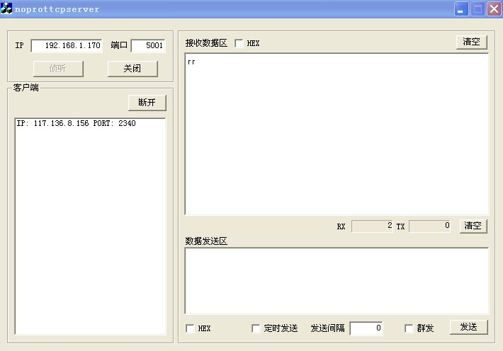 2、打开数据中心软件,把端口设置成5001,点“侦听”,等待DTU连接,如果DTU连接上来后如下图显示: