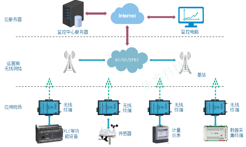无线数据采集传输 : 把现场设备、PLC、仪器、计量表、传感器、采集终端等设备的数据通过4G无线网络实时传输到数据中心。